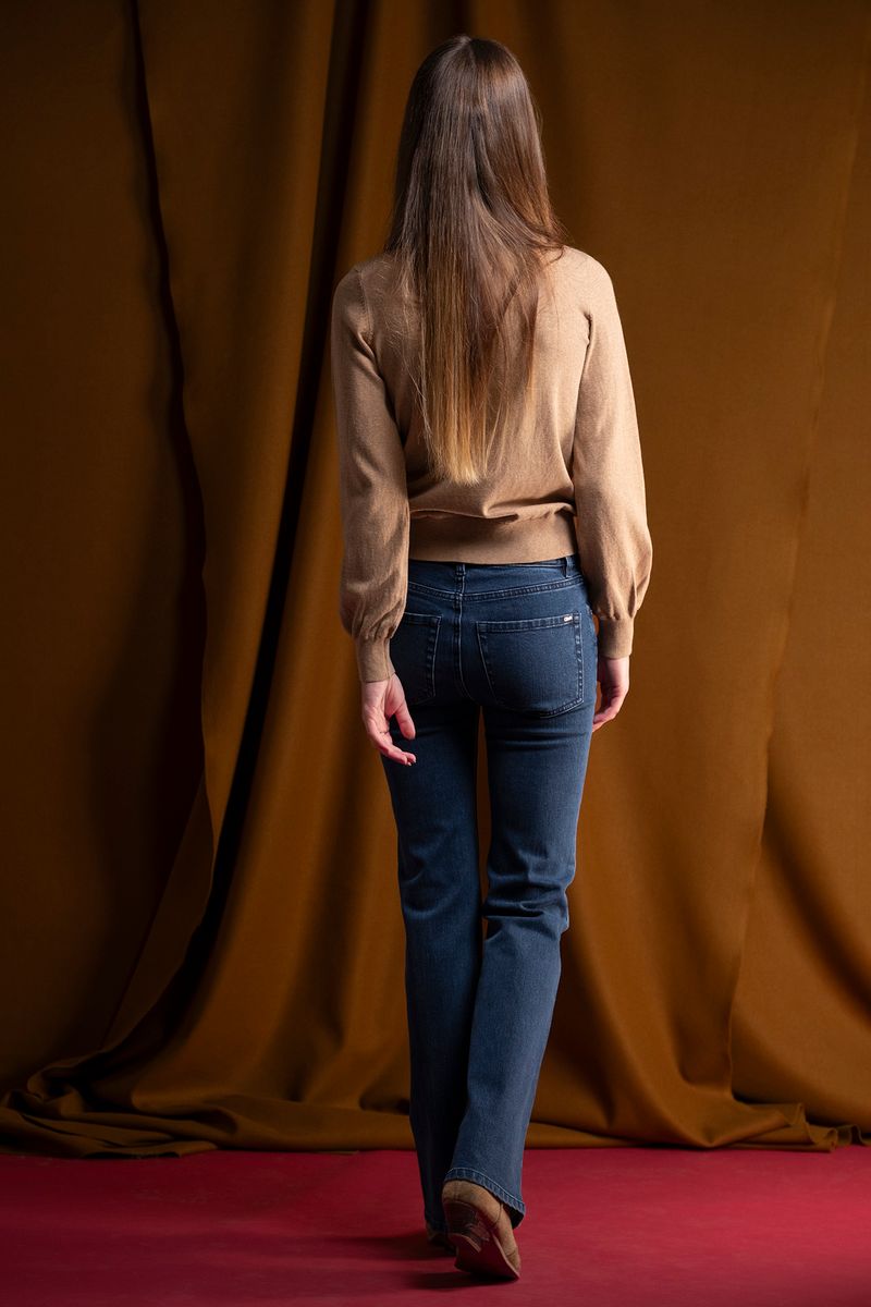 These medium blue denim jeans bring a vintage touch to your wardrobe. The bell-shaped cut lengthens the silhouette and creates an elegant and modern look.