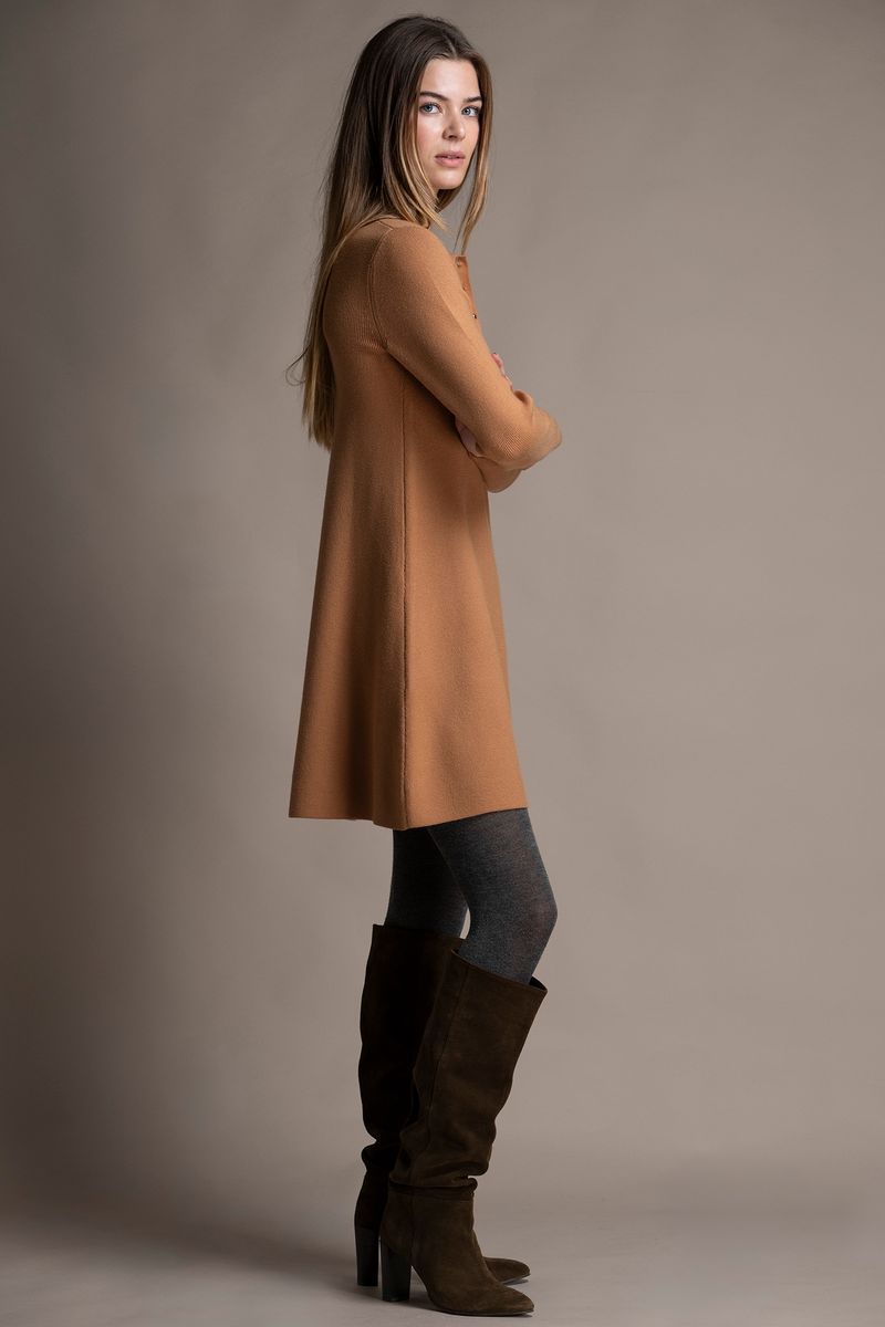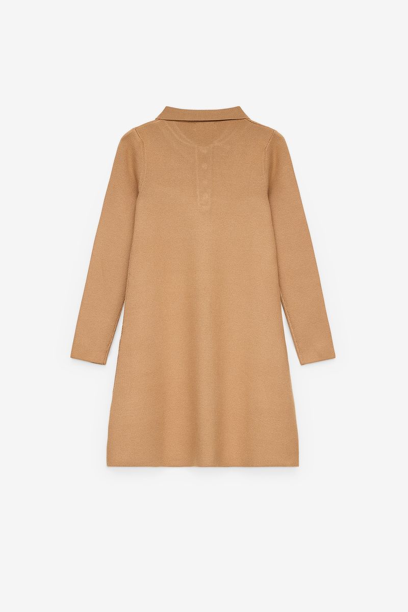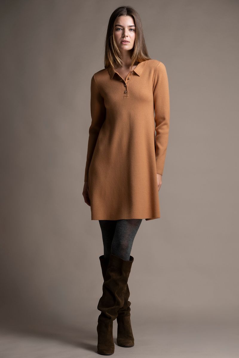 Quebramar women's knitted dress, made with a soft and comfortable mesh that guarantees a fluid and elegant fit. The design features a polo-like collar with front buttoning and long sleeves, combining simplicity with a classic and sophisticated touch. With a slightly flared cut, this dress is perfect for a feminine and practical look, ideal for everyday wear or for more relaxed occasions during mid-season and winter.