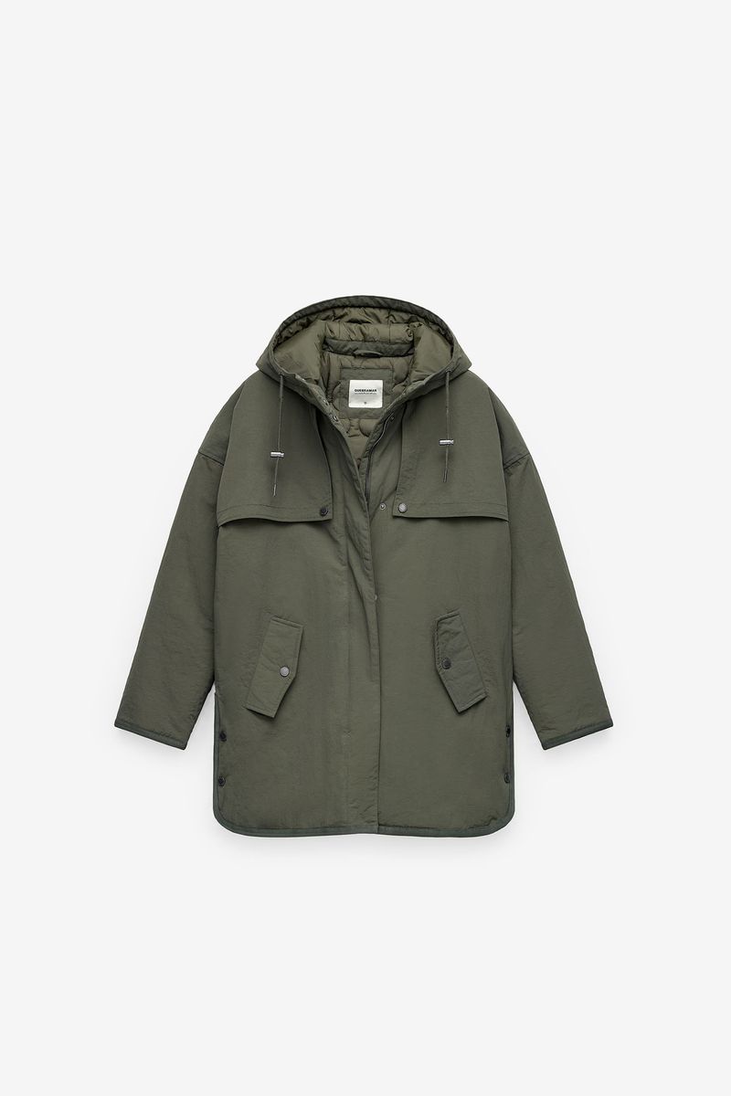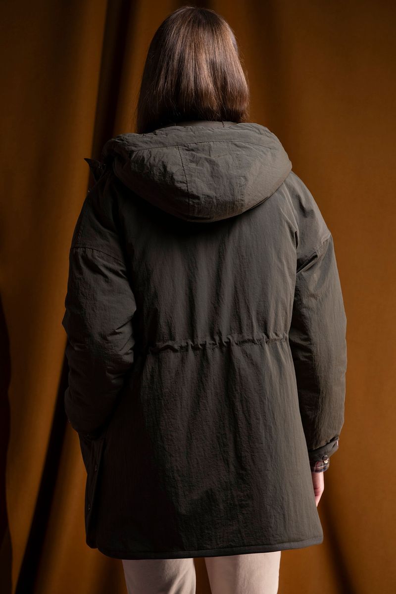 Women's padded parka jacket, developed to offer maximum comfort and protection on cold days. Made of resistant fabric with a soft touch, the model features an adjustable hood with drawstrings, a fully lined interior and lightweight padding that guarantees thermal insulation without adding excessive volume.