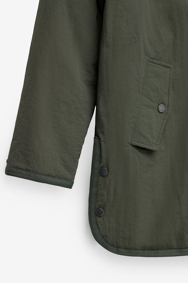 The design has a decorative front flap, combined zip closure and push buttons, as well as two slanted pockets with flaps and buttons that provide everyday convenience. The bar has lateral adjustments with buttons, allowing for a more personalized fit. Available in neutral shades such as beige and khaki green, it is the perfect piece for urban, comfortable and modern looks.
