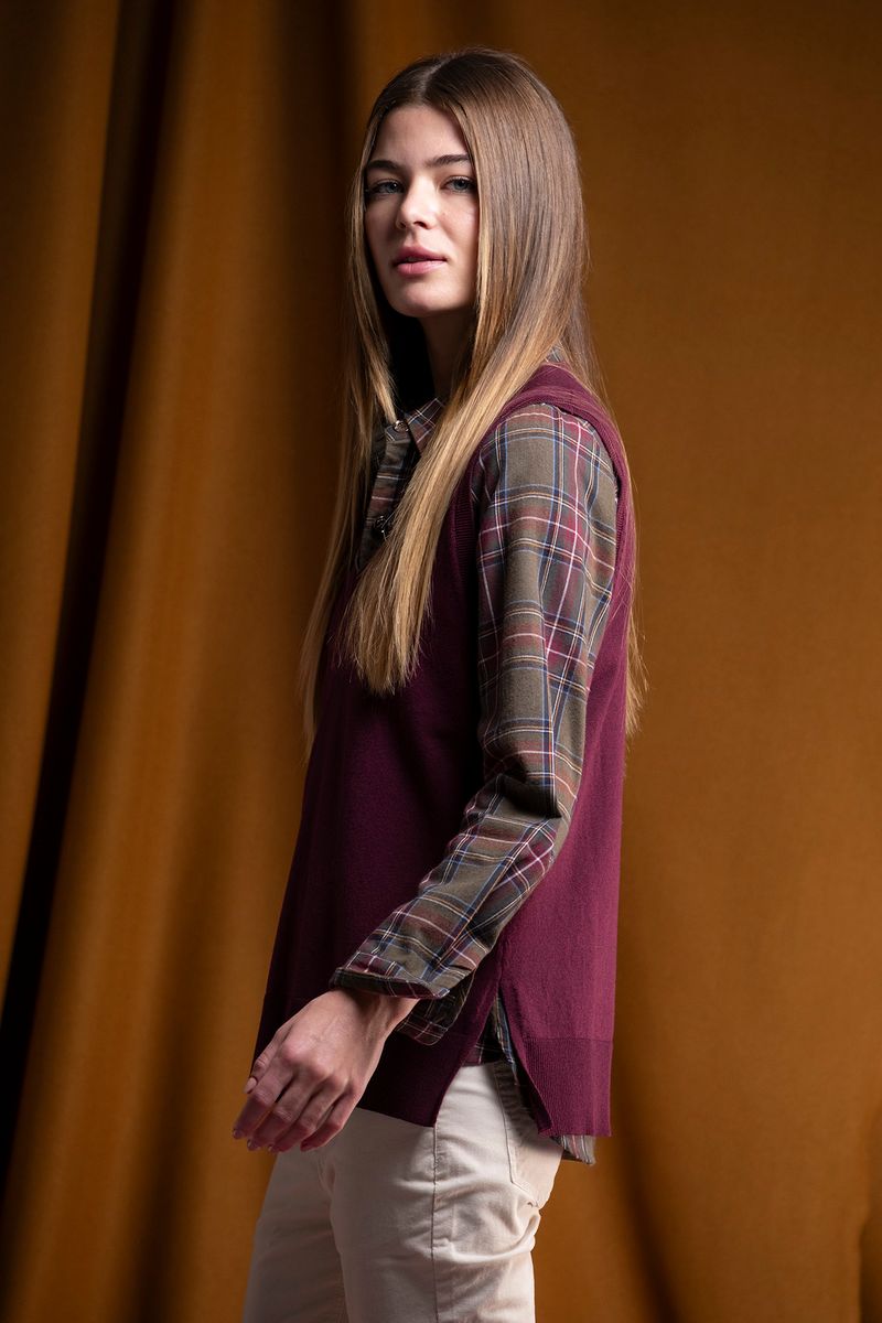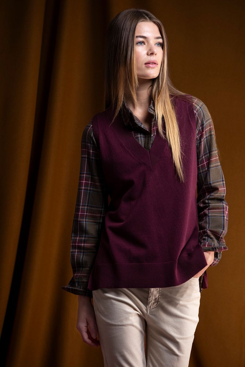 This women's knitted vest combines simplicity and elegance in a timeless design. Made of fine cotton and nylon mesh, it offers a soft touch and a light texture, ideal to wear over shirts or jerseys on cooler days.