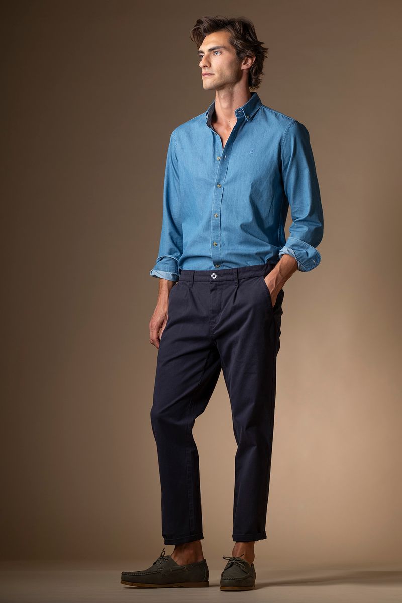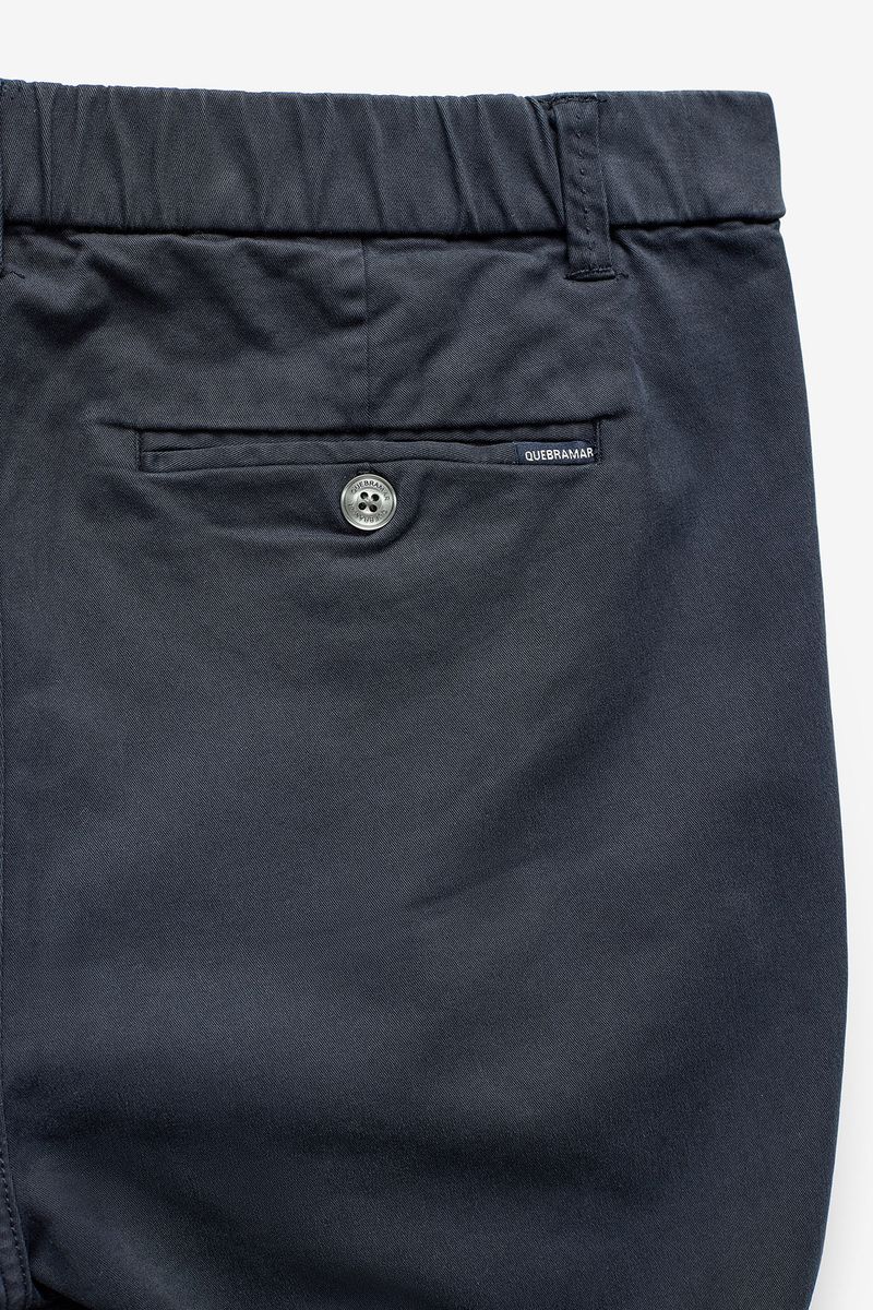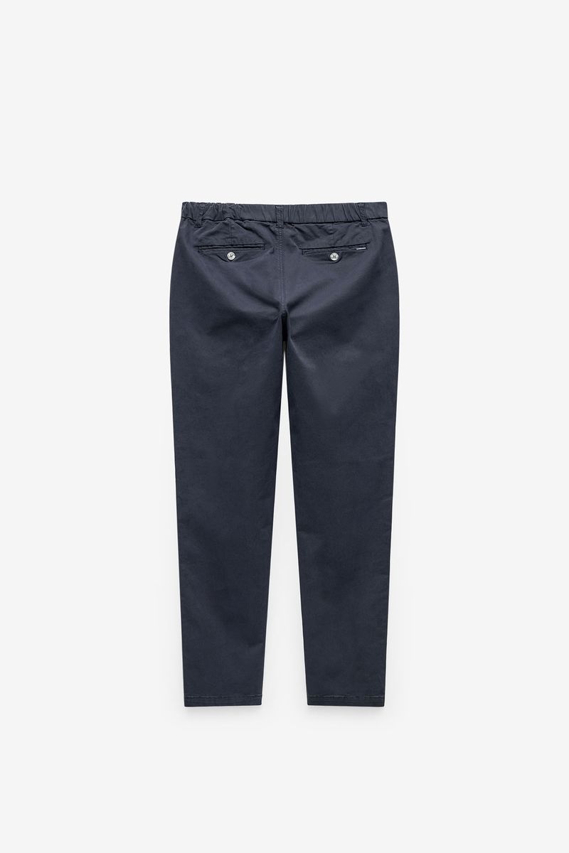Tapered fit chino pants with elastic waistband. Zip and button closure, belt loops and two side and back pockets.