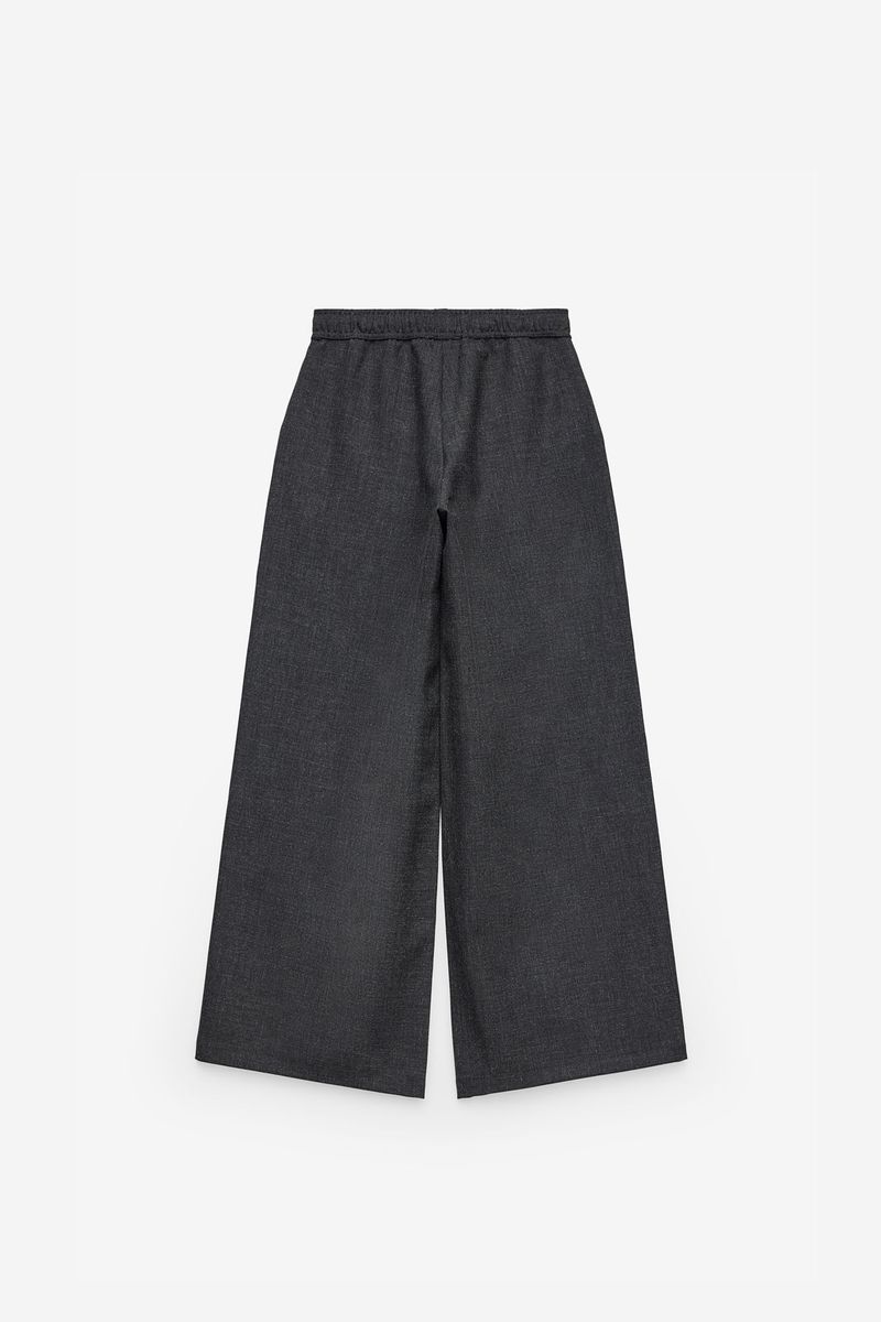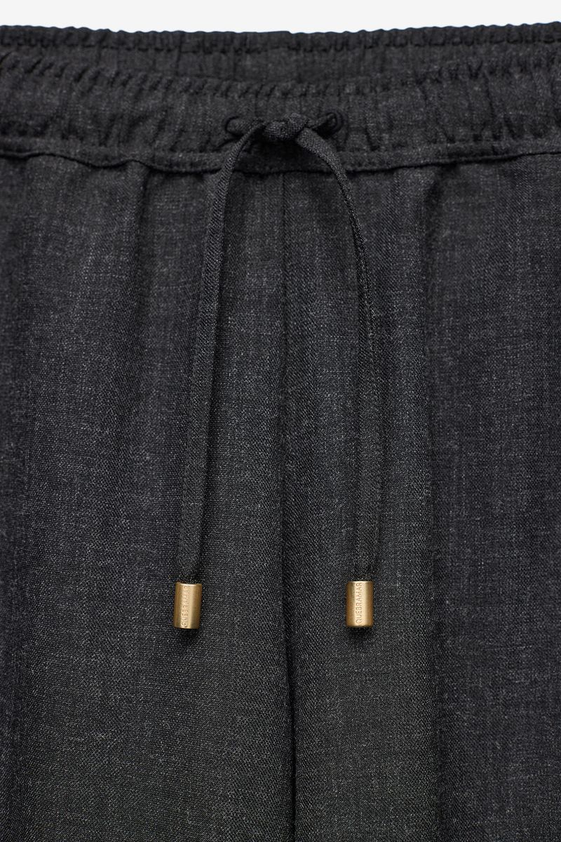 The raised waist with adjustable drawstring ensures a perfect fit, while the dark-toned, soft-touch fabric makes the garment versatile for casual or elegant looks.