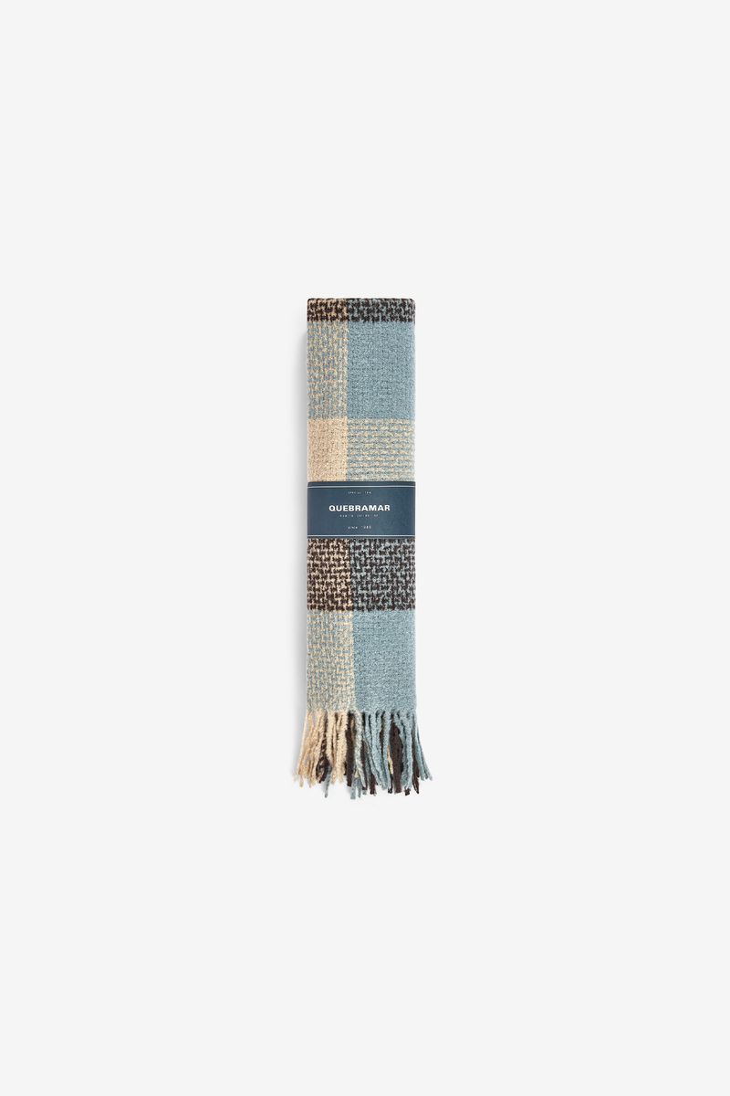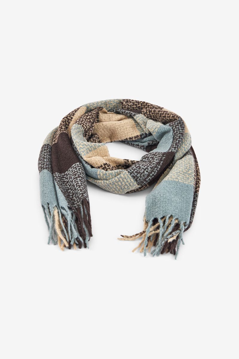 Este cachecol destaca-se pelo seu padrão patchwork em tons suaves de azul, bege e castanho, combinando diferentes texturas e microdesenhos para um visual moderno e acolhedor. O tecido macio e quente proporciona excelente conforto térmico, ideal para enfrentar os dias frios com estilo. As franjas nas extremidades acrescentam movimento e um toque clássico à peça. Versátil e sofisticado, é o acessório perfeito para complementar looks casuais ou urbanos com personalidade.