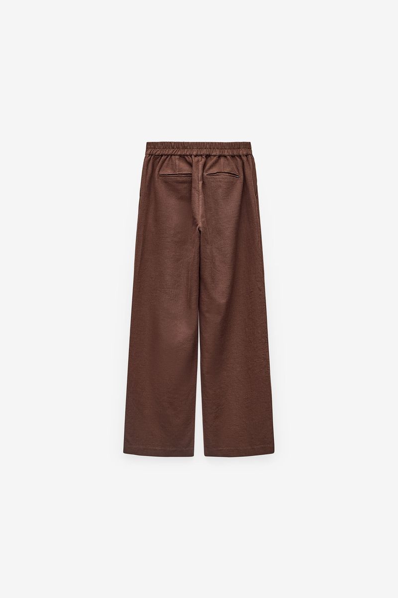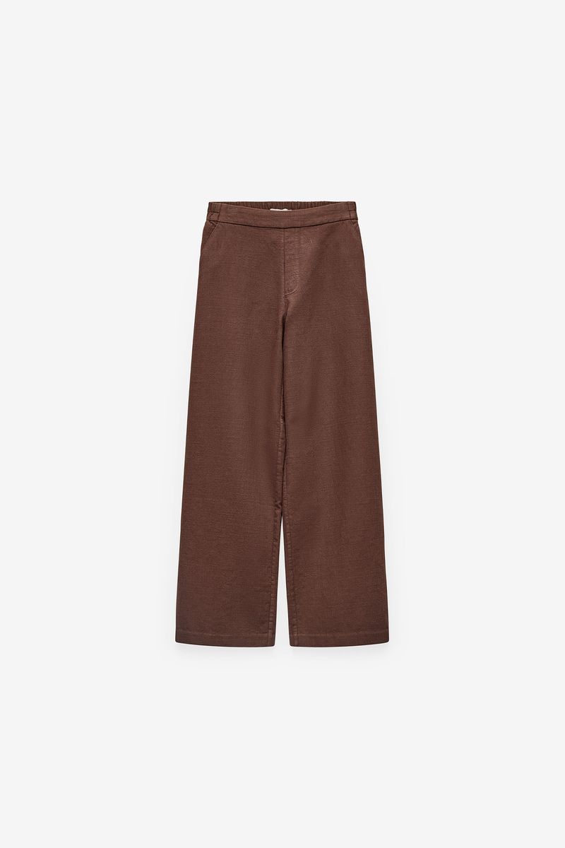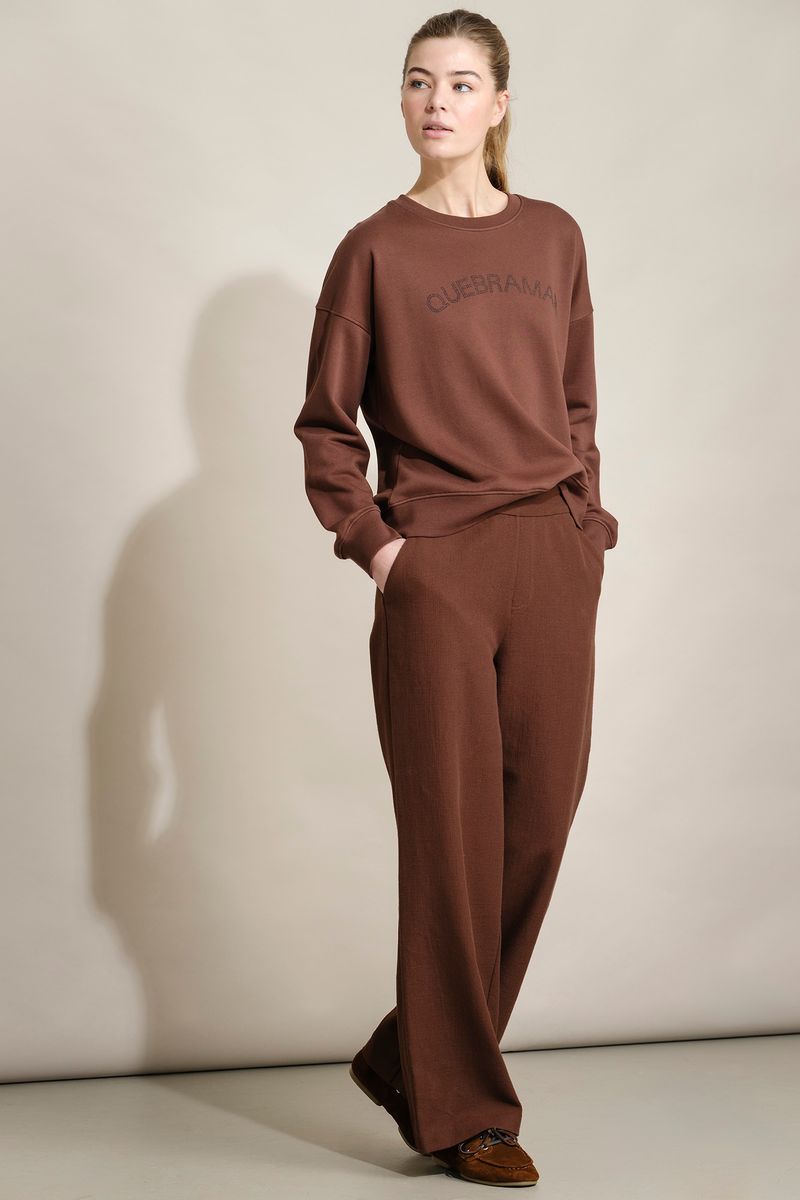 Calças femininas Quebramar confecionadas em tecido leve e confortável, com acabamento texturado e toque suave. O modelo apresenta cintura elástica para um ajuste prático e maior conforto ao longo do dia, e perna larga com caimento fluido, proporcionando liberdade de movimentos. Inclui bolso traseiro discreto, acrescentando funcionalidade ao design. Uma peça versátil e contemporânea, ideal para coordenados casuais e descontraídos, perfeita para usar em contexto urbano ou em momentos de lazer.