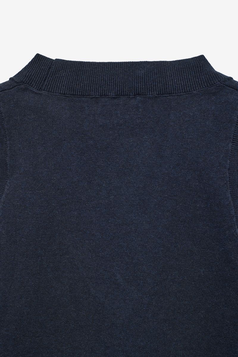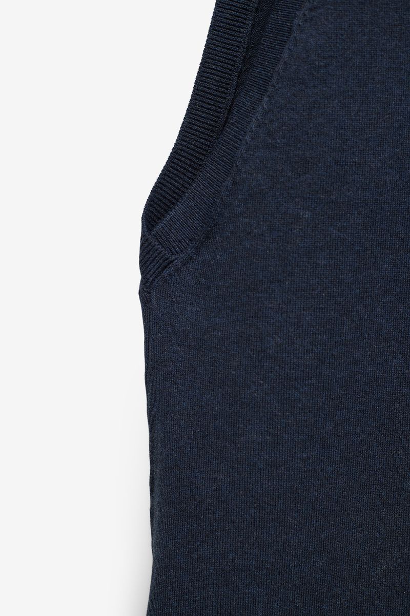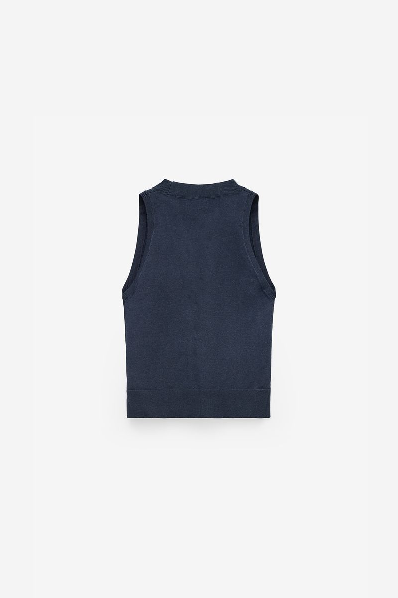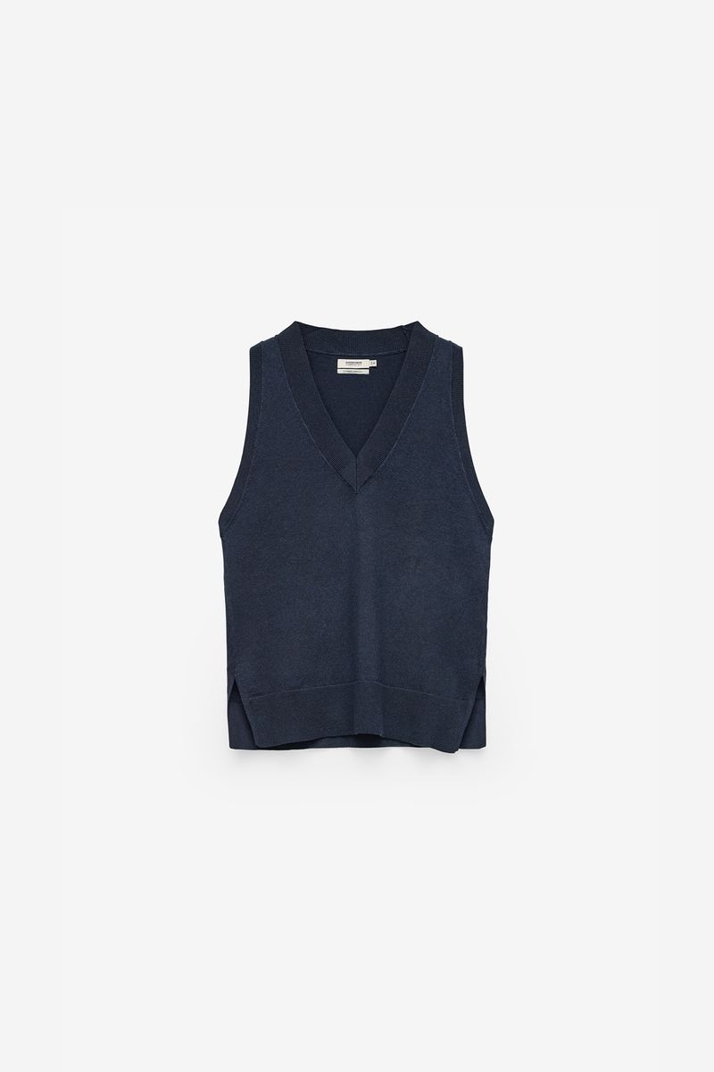 Este colete de malha de mulher combina simplicidade e elegância num design intemporal. Confeccionado em malha fina de algodão e nylon, oferece um toque suave e uma textura leve, ideal para usar sobre camisas ou camisolas nos dias mais frescos.