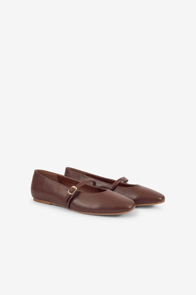 Sabrinas com tira e fivela na gáspea, para atar e ajustar. Biqueira oval e sola de borracha.