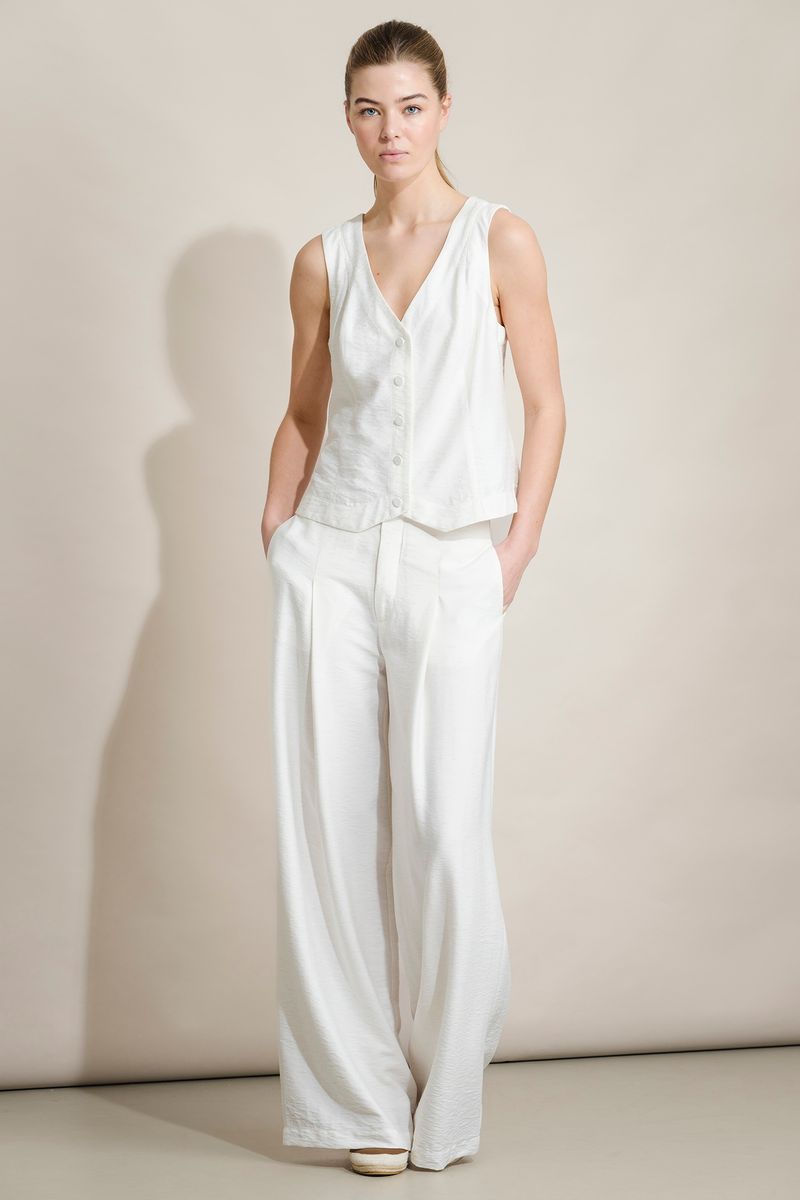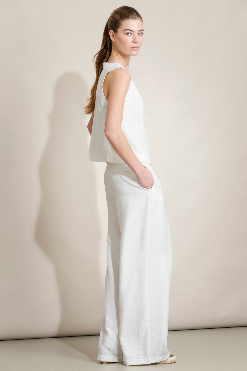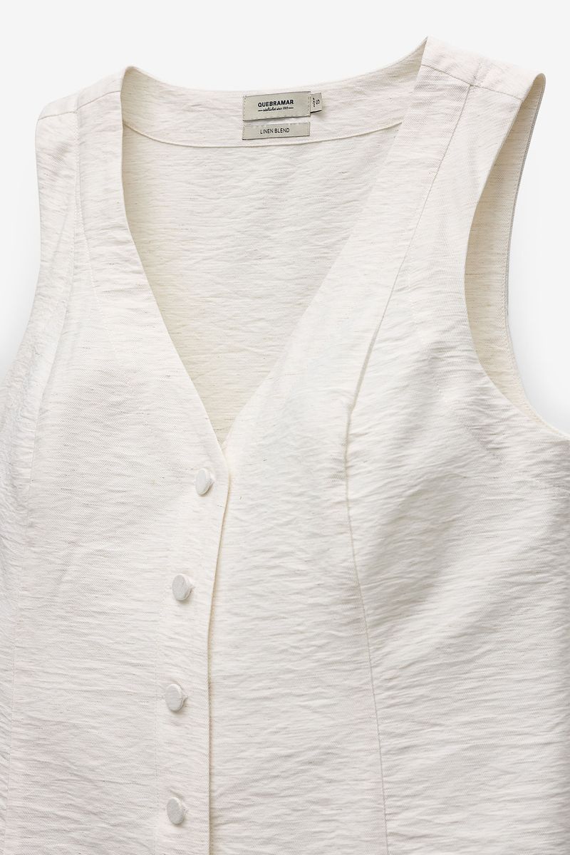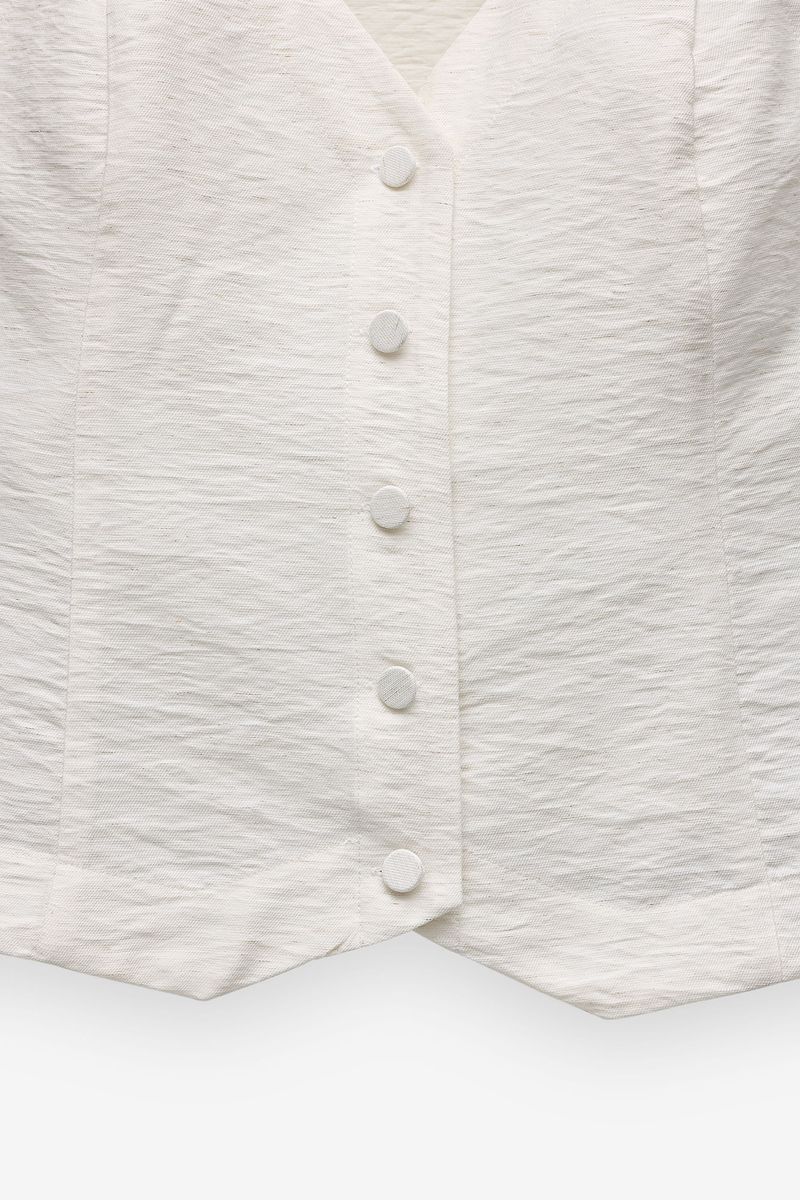 Colete de mulher em tecido texturado, com design elegante e contemporâneo. Apresenta decote em bico e fecho frontal com botões, criando uma silhueta feminina e estruturada. O corte ajustado valoriza a forma, enquanto o acabamento minimalista permite múltiplas combinações.